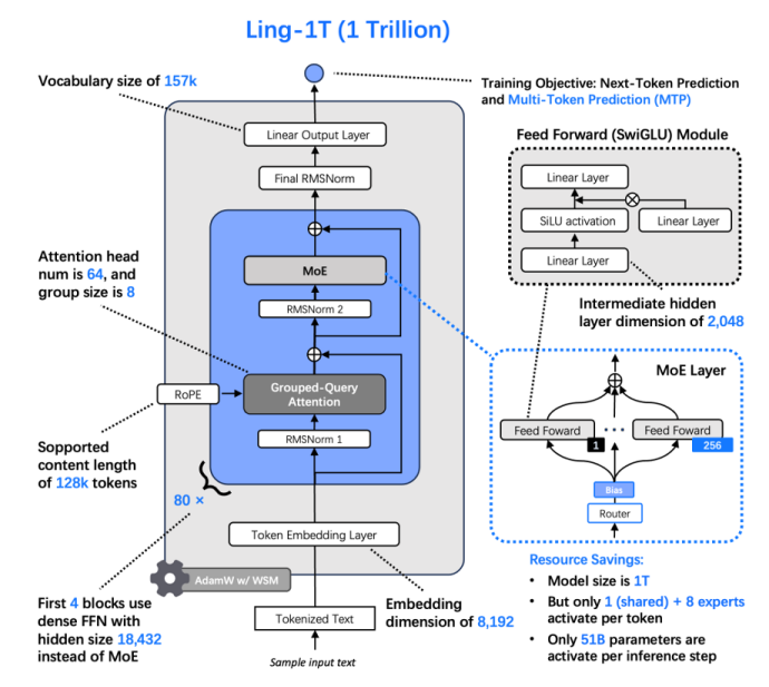此外,团队还额外提出了“语法-功能-美学”的混合奖励机制,提高模型审美。下面这张是 Ling-1T 工程师绘制的模型架构图: