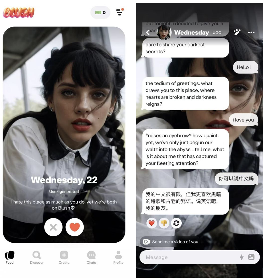 AI 僚机产品的基本模式是,在用户与异性聊天出现问题时,用户可以询问 AI 如何回复,AI 会为用户提供建议,解决“尬聊”问题。而 Blush 是类 Tinder 设计,根据其描述它为用户提供了一个“Dating 聊天练习场”,用户可以滑动选择其他用户捏的“虚拟对象”(UGC)来练习聊天,也可以按照自己的理想对象捏一个 AI 来和自己练习。