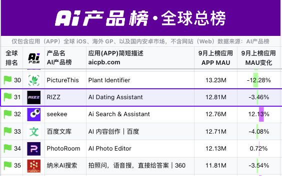 AI产品榜App端9月全球总榜,按MAU排名|图片来源:aicpb.com