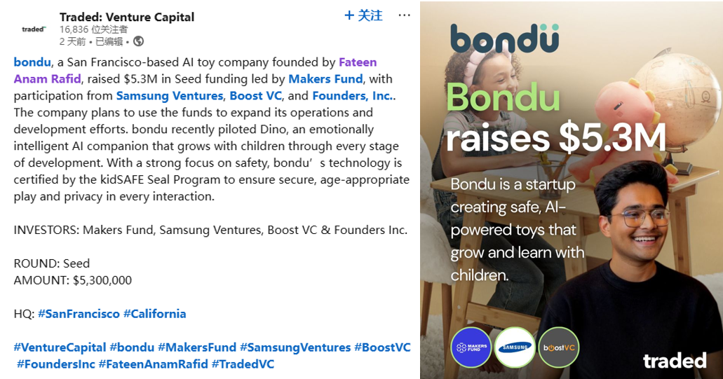 然而近日消息显示,美国 AI 玩具创企 Magical Toys 完成 530 万美元的种子轮融资,由知名投资机构 Makers Fund 领投,Samsung Ventures、Boost VC 以及 Founders Inc. 等机构跟投,该笔融资资金将用于公司运营和产品开发。