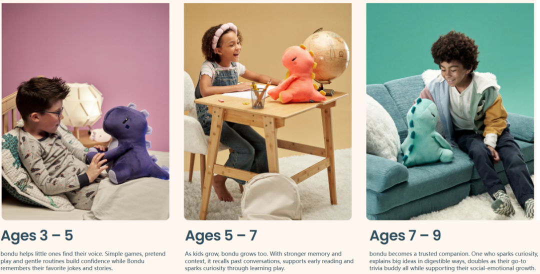 因为 bondu 的目标用户是 3-9 岁的儿童,而这个阶段的孩子好奇心、想象力和情绪感知能力都处于快速增长期。在 bondu 的初始设置阶段,需要父母输入孩子的简要信息,如姓名、兴趣和喜欢的故事等。bondu 在后续与孩子的持续对话中,会不断更新丰富孩子的喜好、互动风格,和当前成长的发展阶段。从官网宣传来看,bondu 根据成长年龄划分出了 3 个阶段: