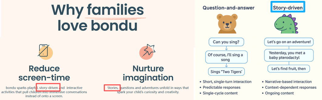 . 用户 3-5 岁:bondu 以简单的模仿游戏和日程规划为主,主要引导孩子辨别声音,并逐步建立语言系统。这个阶段,bondu 会讲一些孩子喜欢的故事和笑话。