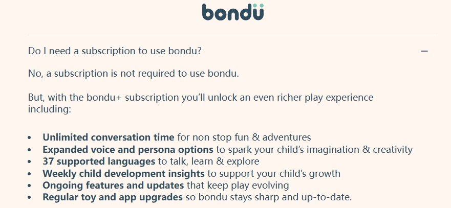 目前,bondu 已开启预定,采用“硬件购买+订阅服务”的商业模式。bondu 玩偶定价 200 美元,暂未查到软件定价标准,但其官网显示免费模式下也可正常使用 bondu,订阅后可享受无限对话时长、多语言选择和功能更新等权益。