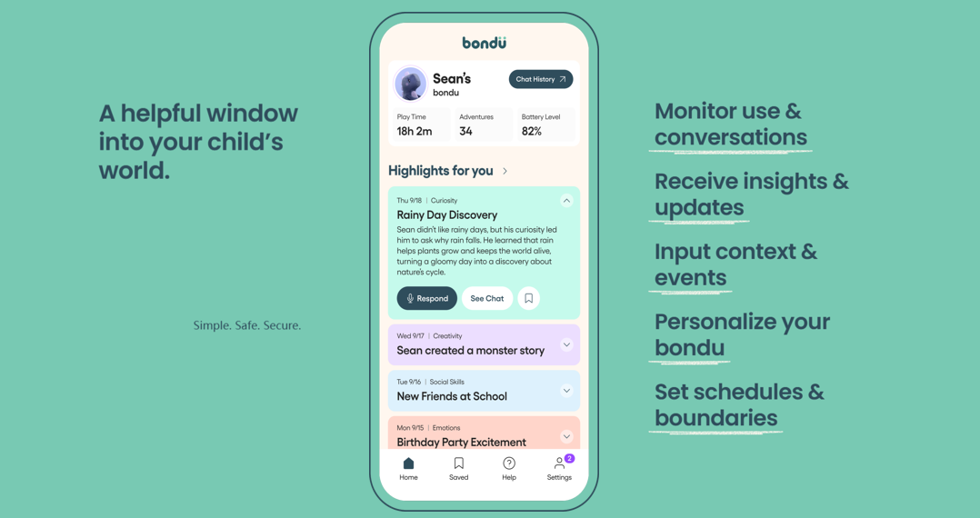 家长层面,家长可以在 App 端看到孩子使用 bondu 的情况,支持对话内容查看、核心要点提取、日程安排设置和危险预警等功能。隐私方面,bondu 不会存储用户声音,其功能也都是根据 COPPA(美国儿童在线隐私法)设计。此外,Bondu 还获得了针对儿童互联技术 kidSAFE Seal Program 的安全认证。