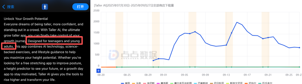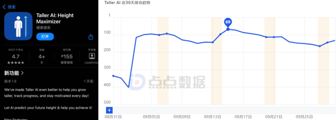 点点数据显示,9 月初,一款宣传能帮用户长高的产品 Taller AI 在美国 iOS 端健康健美类下载榜突然爬榜,并在一周内实现了下载量破万,当时该产品上线还不足一个月。