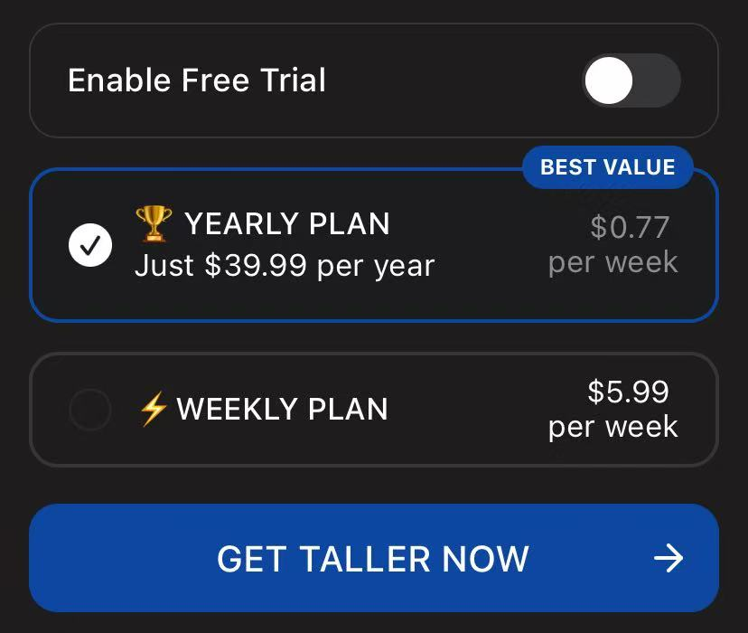 而和我们测试的过的许多产品一样,在一长串的信息填选、“亲测有效”的产品宣传后,App 将付费墙设置在了获取报告的关键节点上。用户只有付费才能获取报告和使用其他功能,否则用户甚至无法打开主界面或倒回上一步。目前,Taller AI 提供年订阅和周订阅 2 种方案,分别定价 40 美元/年和 6 美元/周,其中周订阅可提供 3 天免费试用。