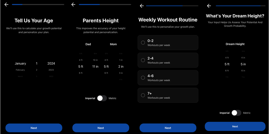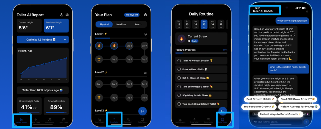 正如其产品名,Taller AI 自称为“终极增高应用”,主打精准预测用户身高,甚至可以协助达成理想身高。如上所述,在我们以往对健康赛道的观察中,该赛道产品的功能大多围绕热量追踪、助眠、专注力培养和美容等主观可控的事情展开,而身高很大程度上取决于基因,后天努力也有,但通常效果甚微。
