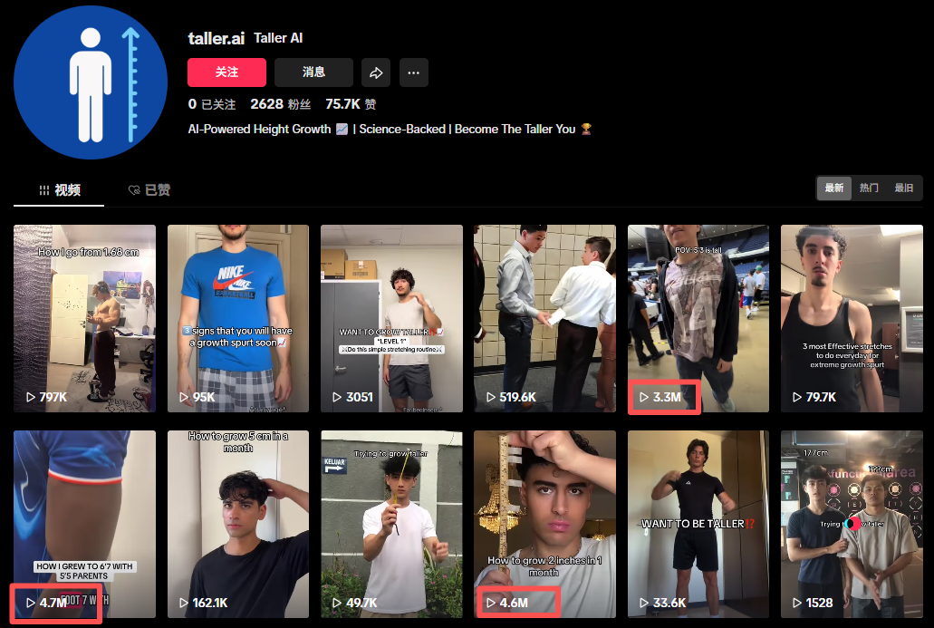 Taller AI 在 X 和 Instagram 上均未开设官方账号,将主要宣传阵地放在了 TikTok,且起号非常之迅速。目前其 TikTok 主页共 12 条视频,分 3 天发布,而非连续输出,内容均为男性用户在 App 指导下实现了身高增长。8 月 27 日当日发布第二条视频时,播放量便出现明显增长,突破 30 万,同日再次发布视频,播放量直接跃升至 460 万。后续视频数据也都极高,并且在内容严重同质化和粉丝量不足 3000 的情况下,又出现了 2 条百万播放量的视频。我们查阅了 TikTok 广告平台也暂未发现其推广痕迹,推测 Taller AI 确实凭借“增高”效果吸引了一大波自然流量。
