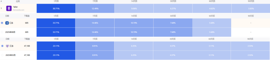 但当我们查询这款被怀疑“行骗”产品的用户留存情况时,Taller AI 的数据表现确实有些出乎意料。由于 Taller AI 的大部分功能涉及锻炼计划和习惯养成,我们选取了同属习惯养成类应用 Me+ Lifestyle Routine 作为参照对象(定位更偏日常计划)。可以看到,不论是前辈 Taller,还是后来者 Taller AI,长高应用们的留存率均高于普通的习惯培养应用,不少数据高出一倍。可见“Taller 们”确实拿捏了用户心理,以单一但针对性强的目标留住了不少用户。