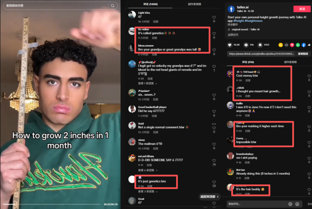 这样的高流量中显然也伴随着不少质疑声。虽然评论区有用户表示很神奇,想要尝试 Taller AI,但更多人直呼可笑,认为视频中人物在测量时使用了障眼法,或者表示身高还是由基因决定,其中也不乏对 Taller AI 强制收费的吐槽。