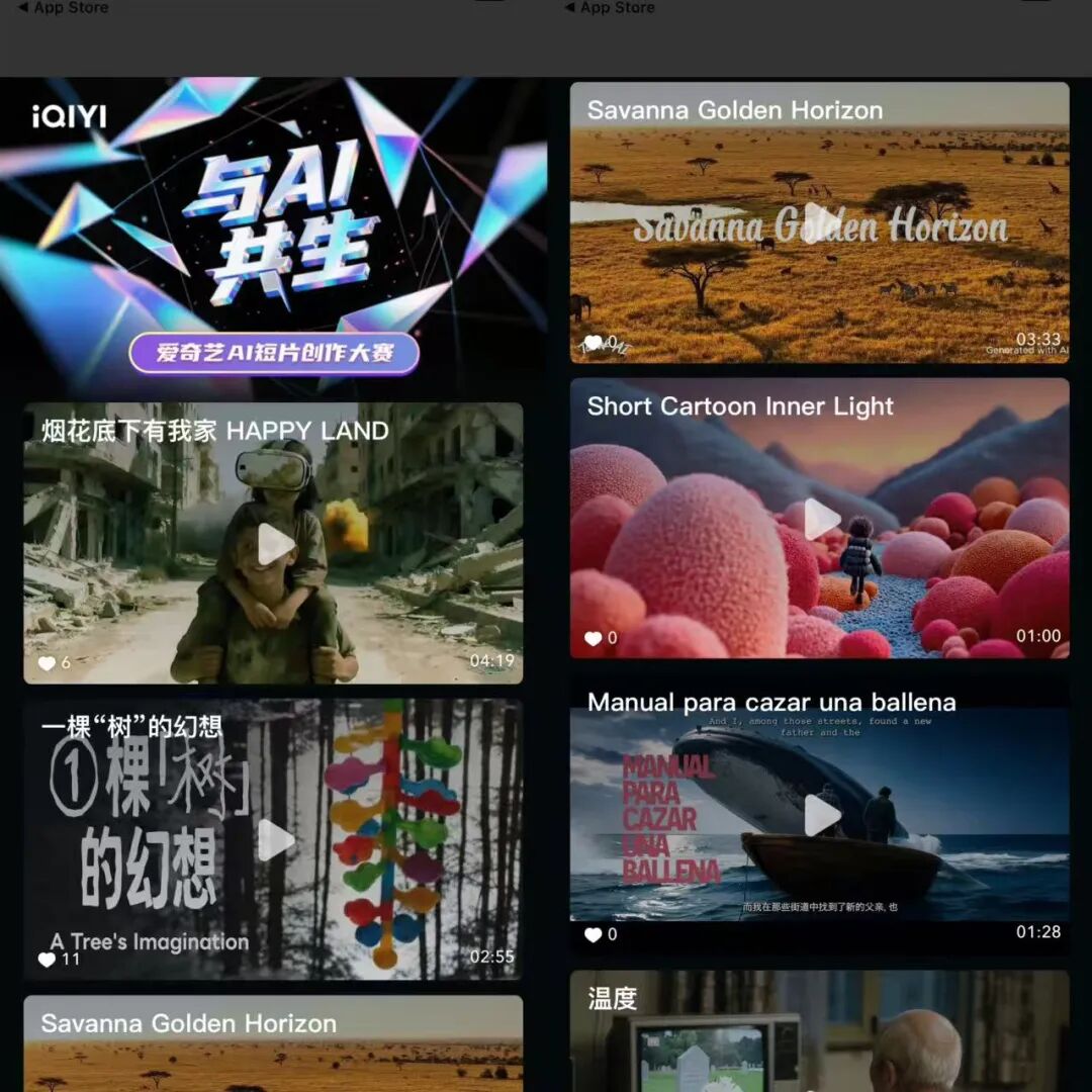 目前大赛已进入最终评委评审阶段,在爱奇艺 APP 内搜索“AI 短片”或“AI 大赛”即可看到通过初筛的 142 份作品。