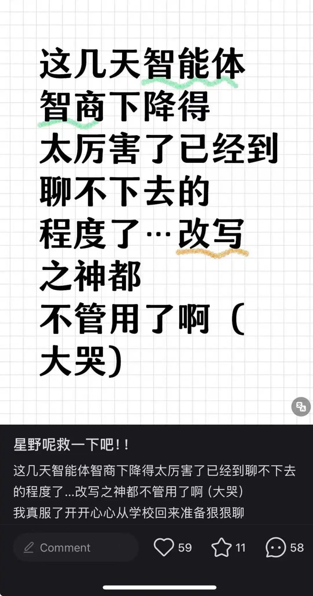 在小红书等社交媒体平台有许多用户吐槽智能体回答“降智”的分享帖,具体包括语言低幼化、“人机味”重、回答相关性低等。