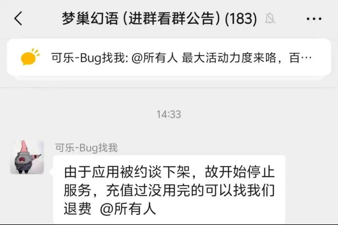 8 月初,AI 陪伴应用“梦巢幻语”在用户群中,仅用寥寥数语官宣了停运消息:“由于应用被约谈下架,开始停止服务。”面对用户的大量询问,官方工作人员仅简短回应称:“我们被举报了,未来也不会复活了。”