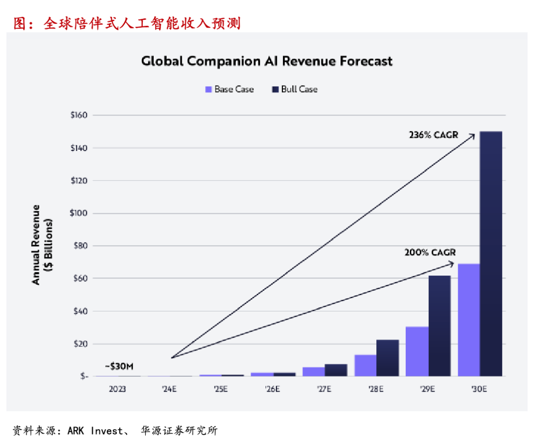 根据 ARK Invest 报告预计,2025 至 2030 年间,“AI+情感陪伴”的市场规模将扩大 2300-5000 倍,从现在的全球年收入 3000 万美元增至 700 亿至 1500 亿美元。