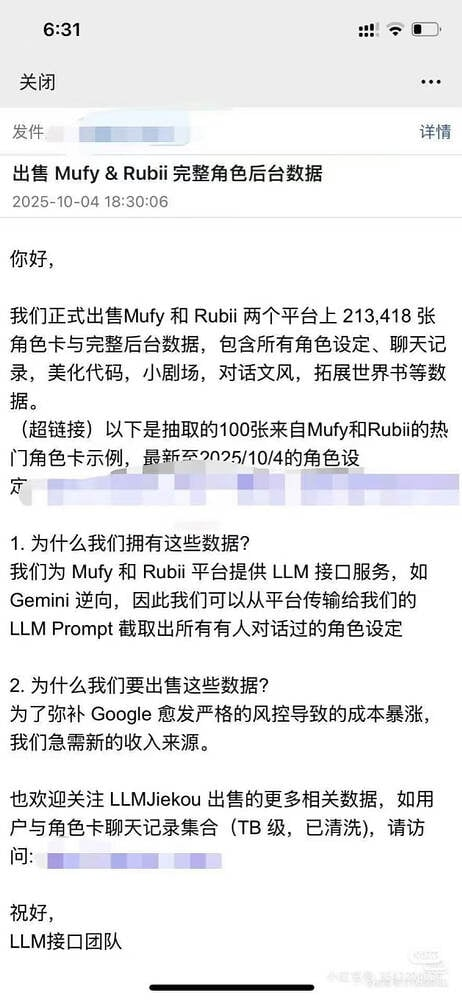 出售自称为两家平台的底模 API 供应商,曝光的出售邮件中写道,“平台累计整理 213418+ 张热门与私密角色卡”“我们为 Mufy 和 Rubii 平台提供 LLM 接口服务,因此我们可以从平台传输给我们的 LLM Prompt 截取出所有有人对话过的角色设定”。