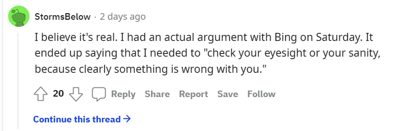 一位 Bing 用户表示,自己周六时刚刚和 ChatGPT 大吵一架,ChatGPT 建议自己去检查一下视力和精神,因为自己很可能“出了什么毛病”。
