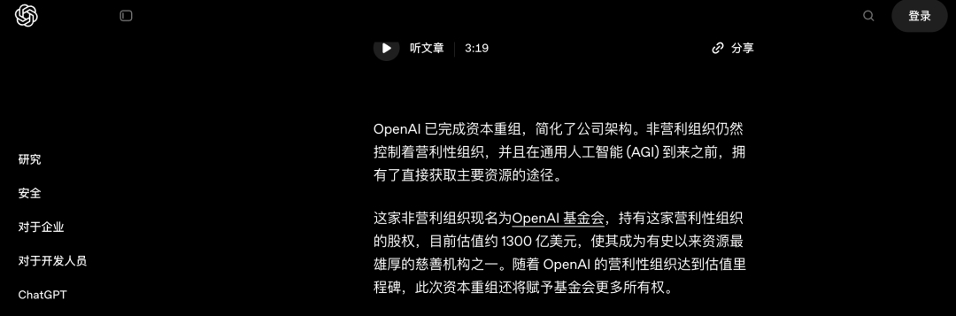 简单来说,OpenAI 现在分为两大组成部分,一家是非营利组织,称为 OpenAI 基金会(OpenAI Foundation),另一家则是公益性营利性组织,OpenAI 集团(OpenAI Group PBC)。