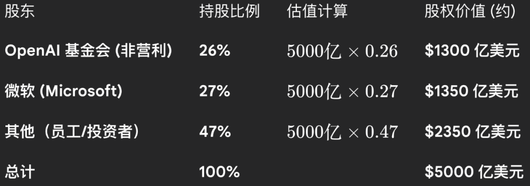 截至重组结束,OpenAI 基金会持有 OpenAI 集团 26% 的股权,根据 OpenAI 公益集团的当前估值,价值约为 1300 亿美元。微软持有 OpenAI 集团约 27% 的股份,其余 47% 由现任和前任员工和投资者持有。