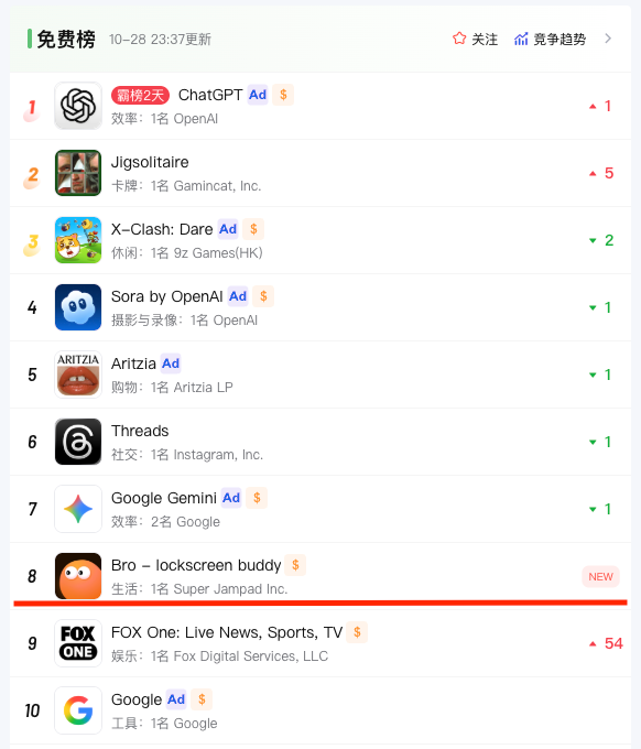 但就这几天,类似设计的产品「Bro」,冲击了美国总榜,最高到了第 8 的位置,日下载量接近 7w。