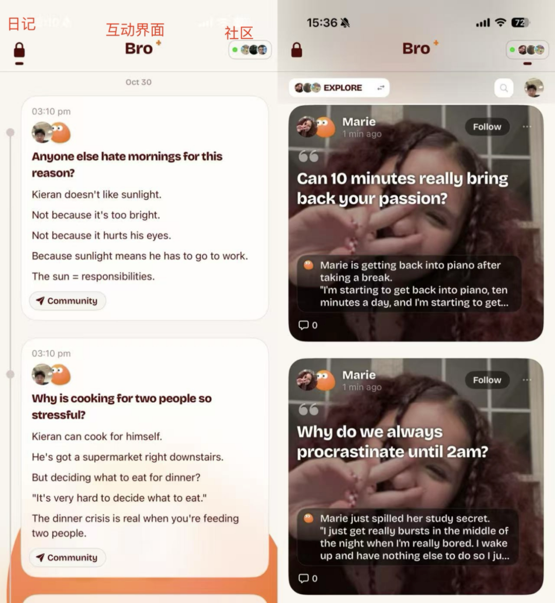 Bro 日记界面(左)、社区界面(右)