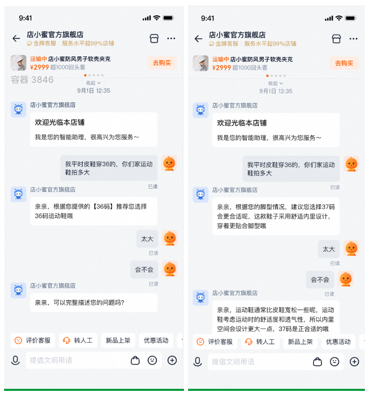 而店小蜜 5.0 能联系上下文读懂真实需求,关联前文“36 码”信息,根据皮鞋和运动鞋不同的松紧度推荐尺码并向用户解释。