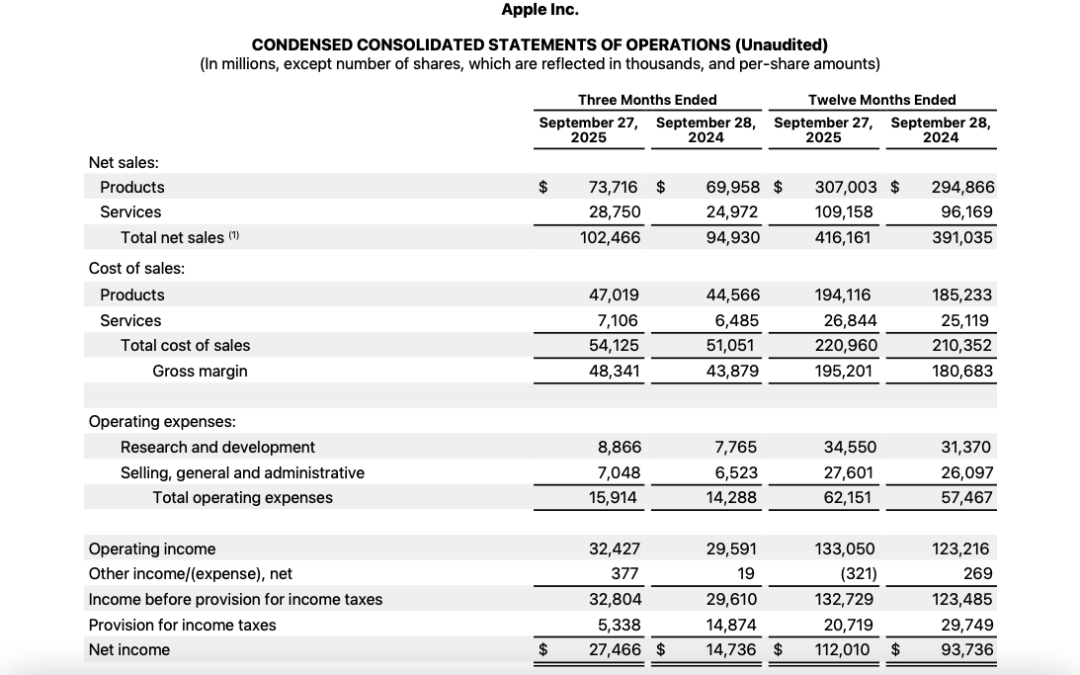据苹果刚刚披露的 2025 财年第四季度财报显示,本季总营收达 1024.66 亿美元,同比增长 7.9%;净利润实现 274.66 亿美元,同比大幅增长 86.4%。