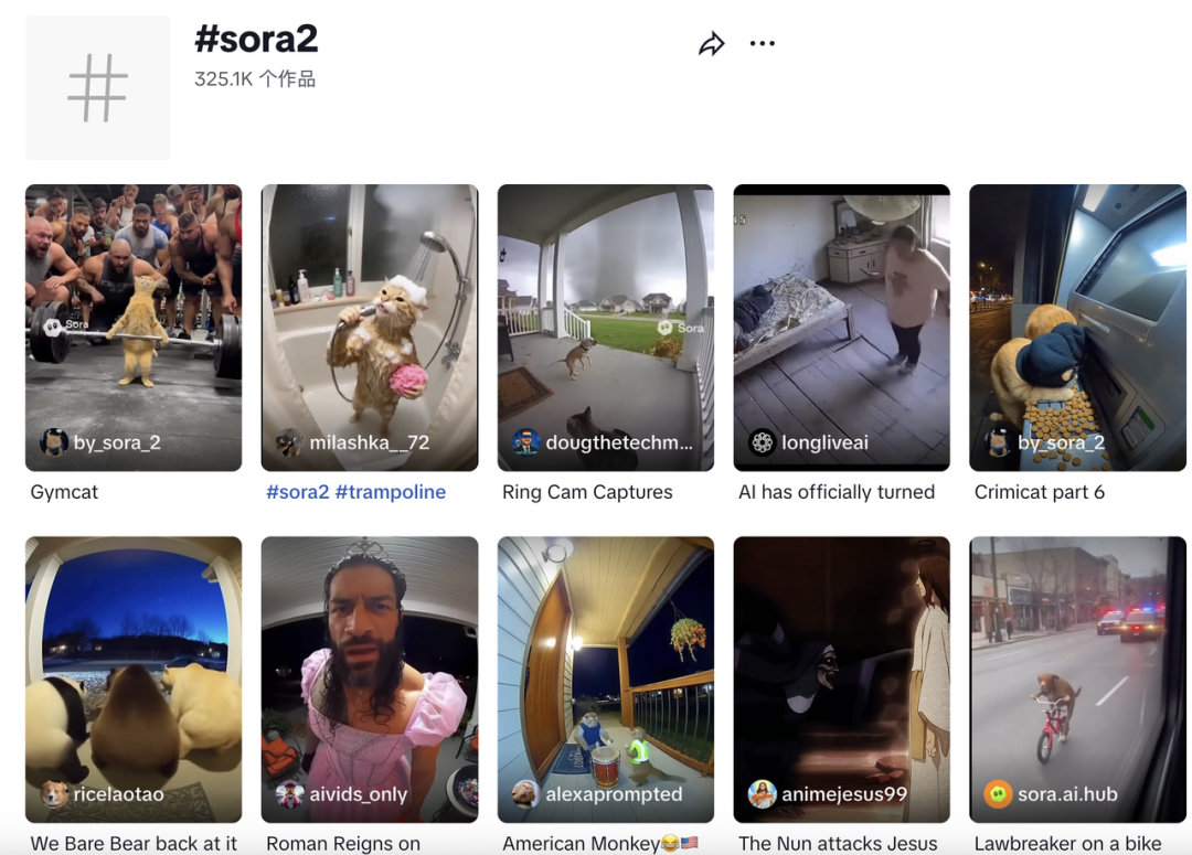 TikTok 无疑是 AI 视频带货的一个重要阵地。在 TikTok 上,#ai 标签下有 2.5 亿条视频,#aivideo 的标签下有 9 万多条视频,#aivideos 的标签下有 25 万多条视频,而 #sora2 的标签经过一个多月的时间则已有 32 万条视频。