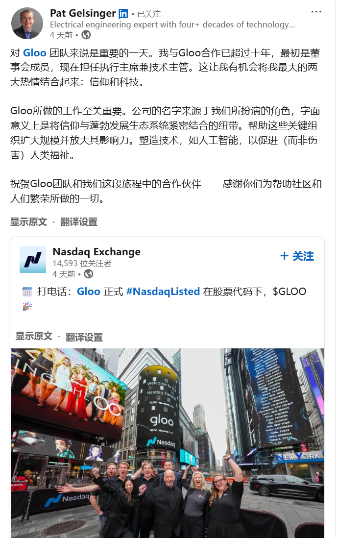 为了做好这个产品,他们还邀请了前英特尔 CEO Pat Gelsinger 出任了 Gloo 技术主管兼执行主席,主导虚拟助手与信仰对齐大模型开发。