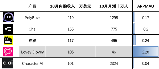 但是「LoveyDovey」不一样,这款应用开辟了 AI 社交“按句收费”的订阅模式,从 Day1 用户就会明白每次互动都在消耗资源,不付费的用户在相当早期就被筛选掉了。于是到今天我们首先看到产品在数据层面上的分化,「Character.ai」、「PolyBuzz」、「猫箱」都是百万美元以上的月流水对应着起码大几百万的月活用户,但是「LoveyDovey」同样的收入水平,月活用户就 40 万左右,独有一种“四两拨千斤”的美感。