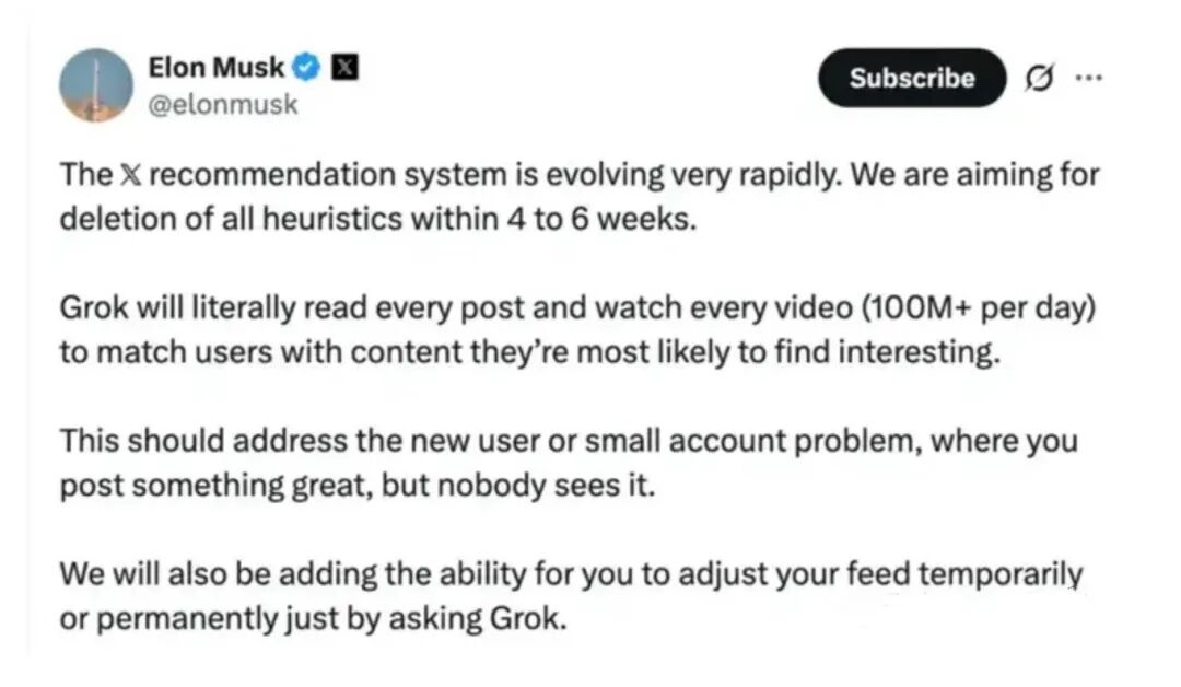 ● 11月,马斯克宣布X用AI模型替代了大量员工,负责平台安全的工程团队裁员90%。图源:社交媒体
