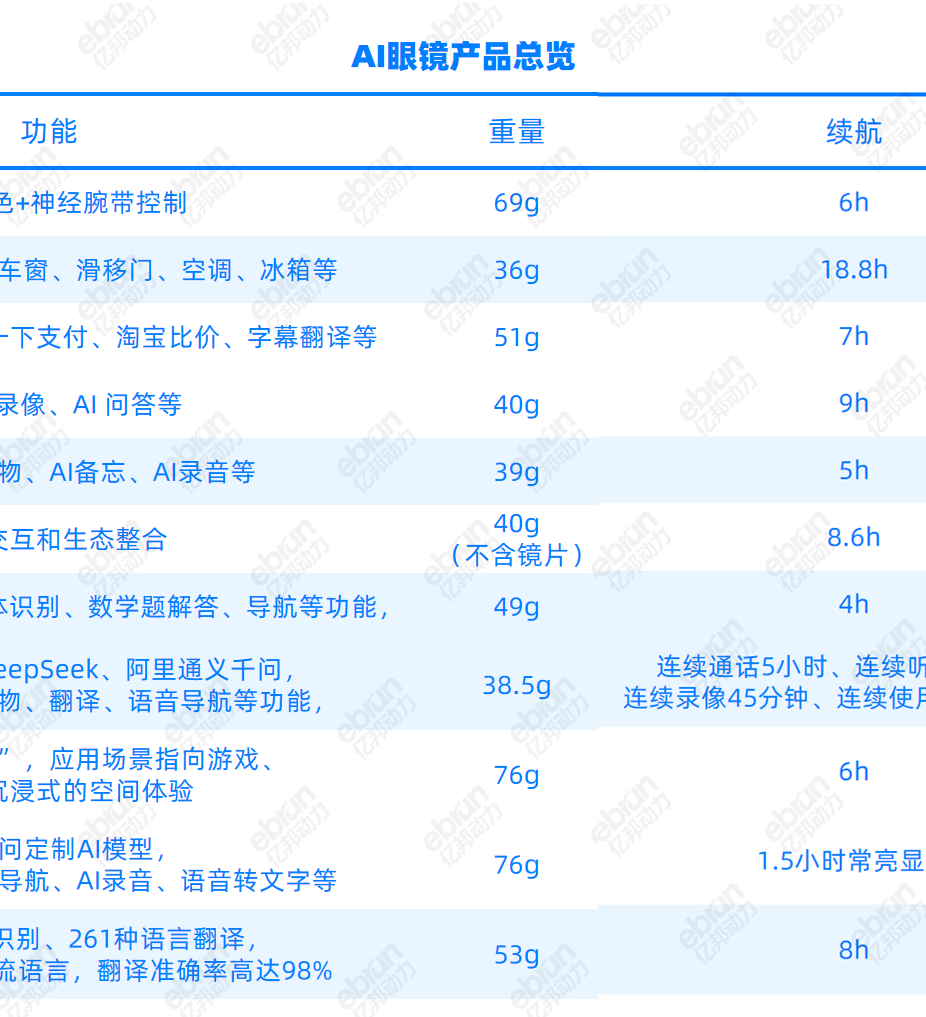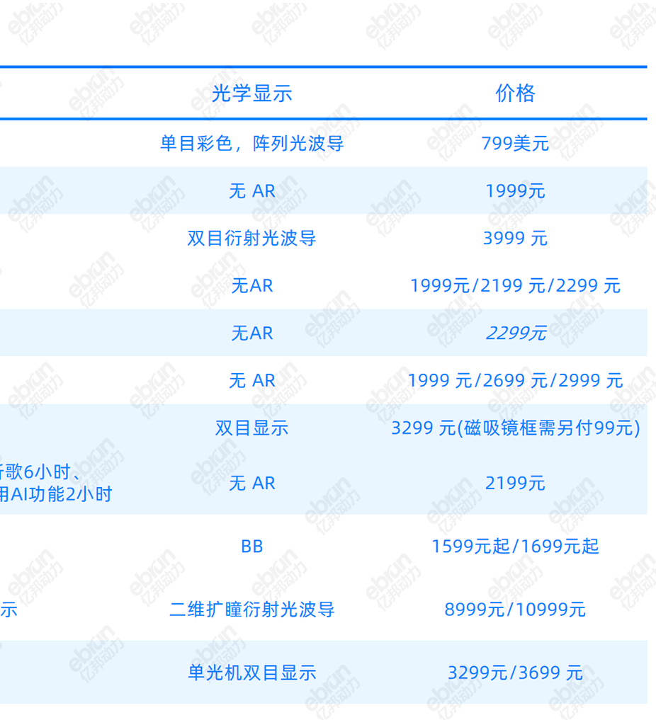 这些眼镜外观类似普通黑框眼镜,重量在 39 克~50 克之间,比近视眼镜(20g-25g)略重,普遍配有摄像头、麦克风、扬声器,搭载大模型和 AI 助手,可以录音录像、拍照识物,续航 6h-8h。价格则 500-8000 元不等,有无 AR 设备成为价格分水岭,无 AR 的 AI 眼镜价格在 500-2000 元不等,单目 AR 眼镜价格 2000 元以上,双目 AR 眼镜价格 3000 元以上。