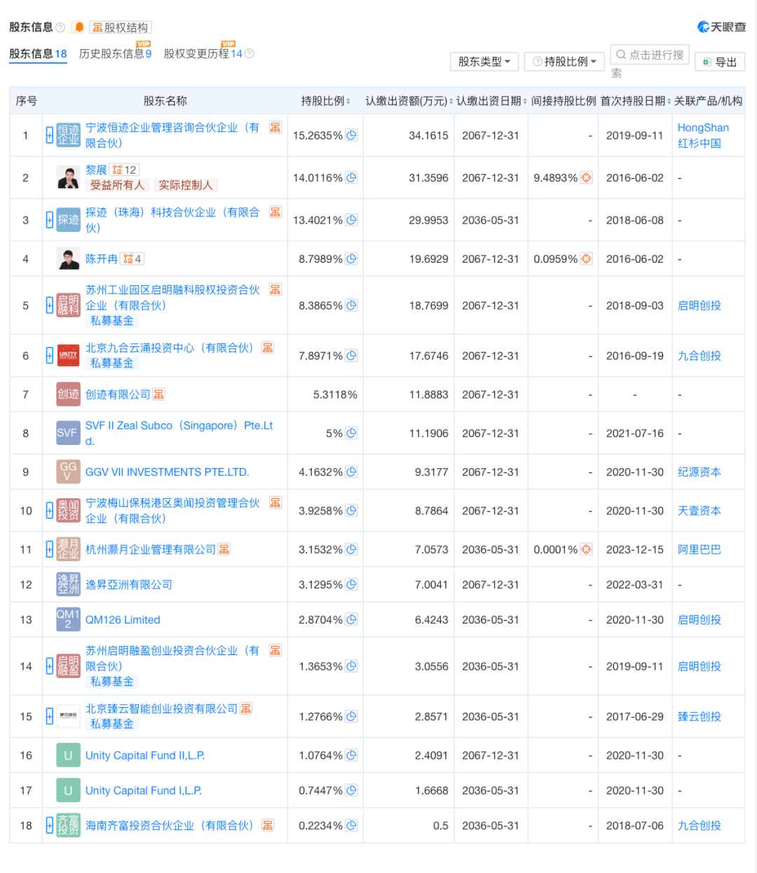 此外,红杉中国持有探迹科技 15.2635% 股份,系第一大外部股东;启明创投合计持股 12.6222%;九合创投合计持股 8.1205%;GGV 纪源资本持股 4.1632%;天壹资本持股 3.9258%;阿里巴巴直接持股 3.1532%,间接持股 0.0001%。