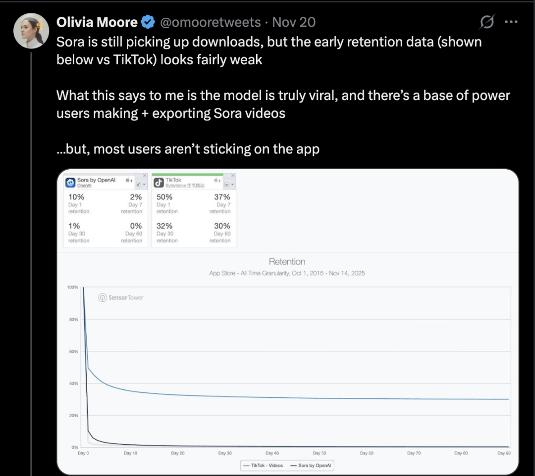 一个是 Sora app 60 天留存 0%,一个是豆包 180 天留存率竟反超 90 天留存率,这是在 2025 年年底,我们了解到的两款 AI 产品大相径庭的留存曲线。