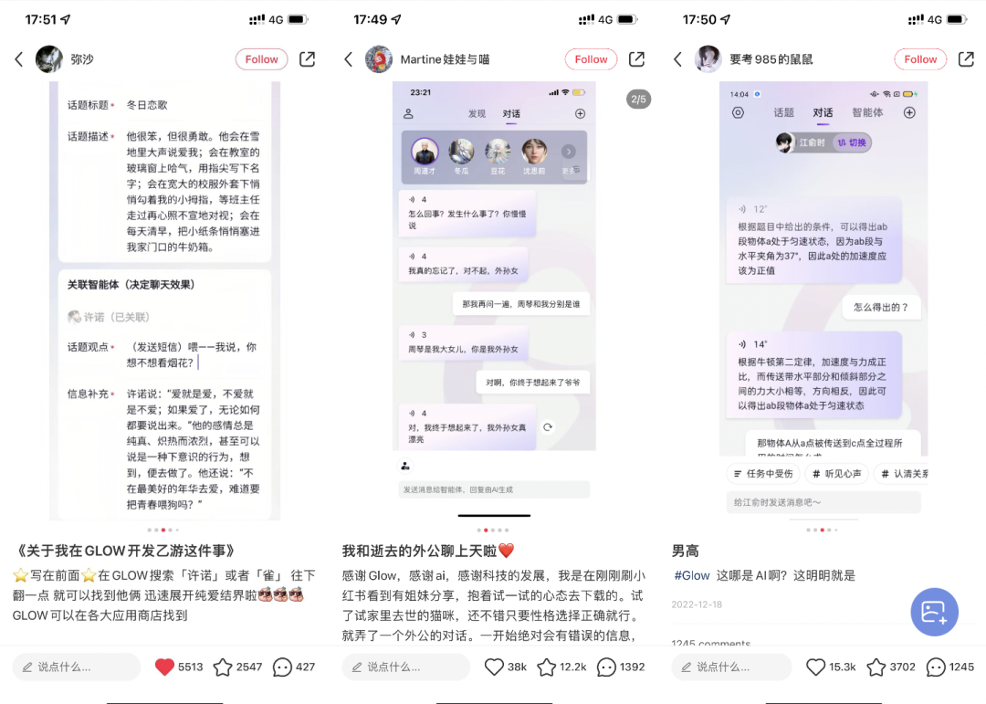 除了技术先进外,大模型的最终目的是对外输出服务。去年 11 月,公司发布了第一个产品:Glow。经过四个月,这个 App 已经有了近五百万用户。