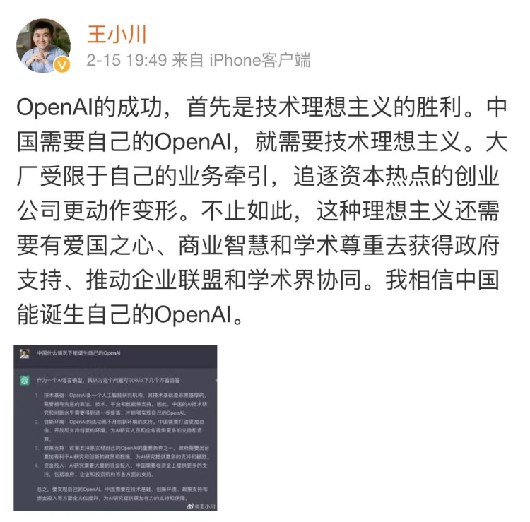 你索性可以认为,王小川就是通过这条朋友圈,隐晦地宣示了自己即将进入“中国的 OpenAI”这一关键战场。