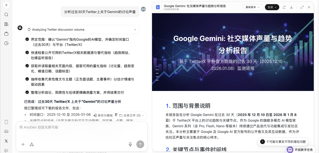 以“数据调研报告”为例。当输入“分析过去 30 天 Twitter 上关于 Gemini 的讨论声量”时,AnyGen 并不是简单地调用大模型生成一段似是而非的评论,而是内置了一个类似爬虫的 Agent 去实时抓取数据。