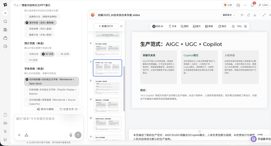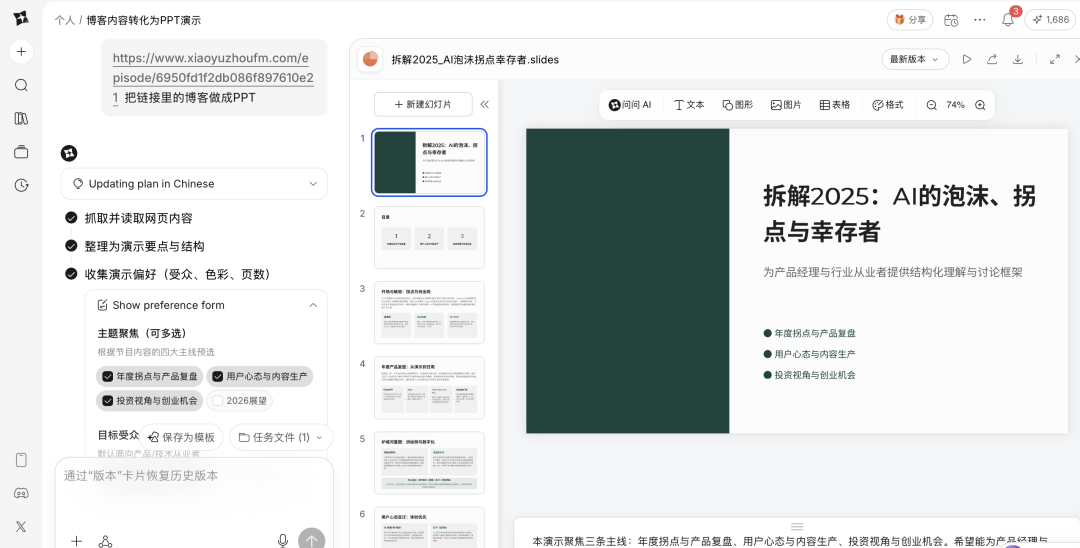 再看 PPT 场景,AnyGen 接收到指令“把链接里的播客变成 PPT”时,会收集用户的演示偏好(目标受众、字体风格)生成原生“.pptx”文件。虽然内容还是图片,但是已经可以用幻灯片的方式来播放。