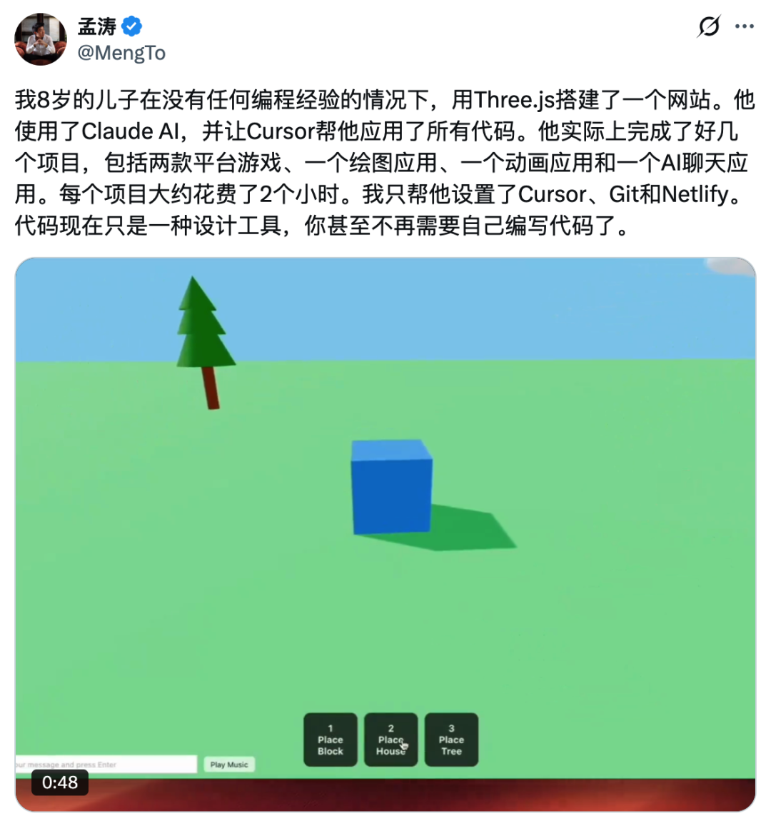 新加坡一位程序员爸爸分享过他 8 岁儿子的故事:小男孩 Kyo 完全没学过编程,用 Claude 和 Cursor,每两小时就能做出一个项目,这条帖子引发了很大的关注。