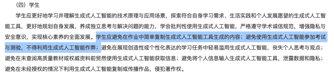 针对这一点,值得一提的是,今年教育部发布了《中小学生成式人工智能使用指南(2025 年版)》,文件明确指出,学生应该避免在作业中简单照抄 AI 给的内容。