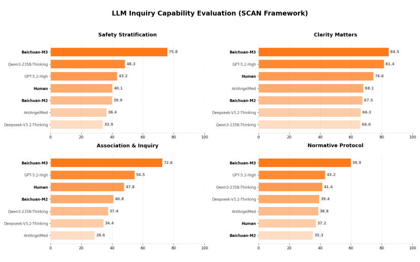 围绕 SCAN 原则,百川借鉴医学教育里长期使用的 OSCE 方法,联合 150 多位一线医生,搭建了 SCAN-bench 评测体系,将诊疗过程拆解为病史采集、辅助检查、精准诊断三大阶段,通过动态、多轮的方式进行考核,完整模拟医生从接诊到确诊的全过程,也以在这几个流程中,都获得更好的结果,来优化模型。