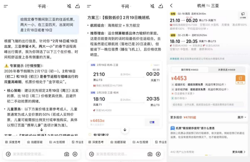 更复杂一些的操作也可以,比如像聊天一样说“想给爸妈家买个扫地机器人,预算 2000 到 4000,家里还有只猫”,千问 App 就能推理出“防缠绕”、“高温杀菌”的需求,并给出合适的商品;准备春节出游,千问 App 一边调用飞猪来预定机票和酒店,一边调用高德来做行程规划和预定年夜饭,甚至直接打电话订餐厅。