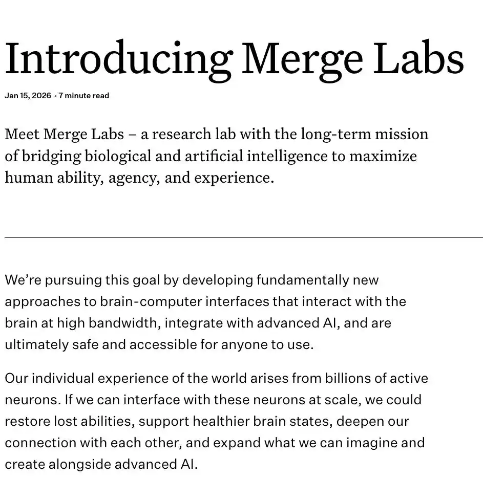 Merge Labs 表示,其长期使命是连接生物智能与人工智能,以最大化人类能力、能动性和体验。为实现这一目标,公司正在开发全新范式的脑机接口,这些接口能与大脑展开高带宽交互,并集成先进的人工智能,最终做到安全且人人可用。