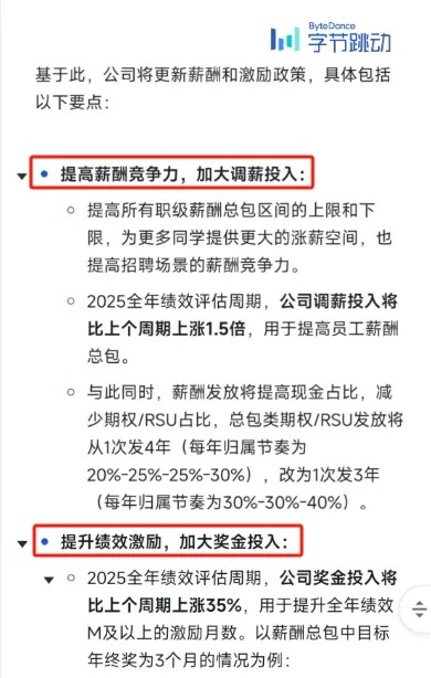 此前为更好地吸引、激励和保留优秀人才,字节跳动已经加大人才投入,确保员工薪酬竞争力和激励回报在各个市场都领先于头部水平。调薪投入将比上个周期上涨 1.5 倍。同时,薪酬发放将提高现金占比,减少期权/RSU 占比。绩效奖金方面,公司奖金投入将比上个周期上涨 35%,用于提升全年绩效 M 及以上的激励月数。
