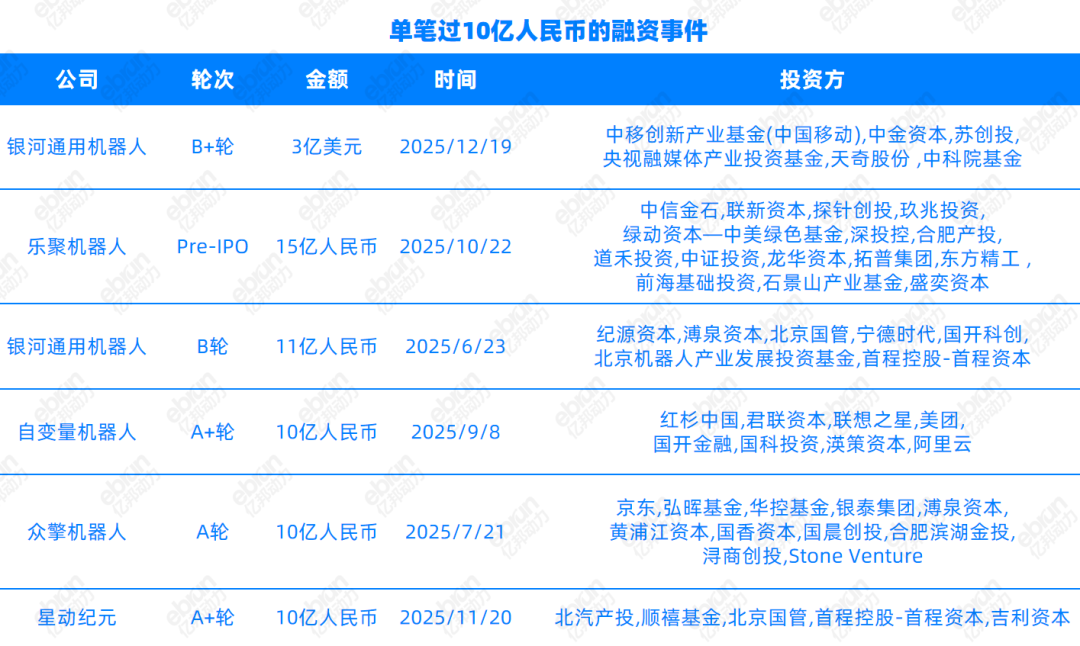 从单笔融资金额看,全年共有 96 笔融资过亿元人民币,其中 6 笔更是突破 10 亿元大关,被投资企业包括银河通用、自变量机器人、乐聚机器人、众擎机器人。