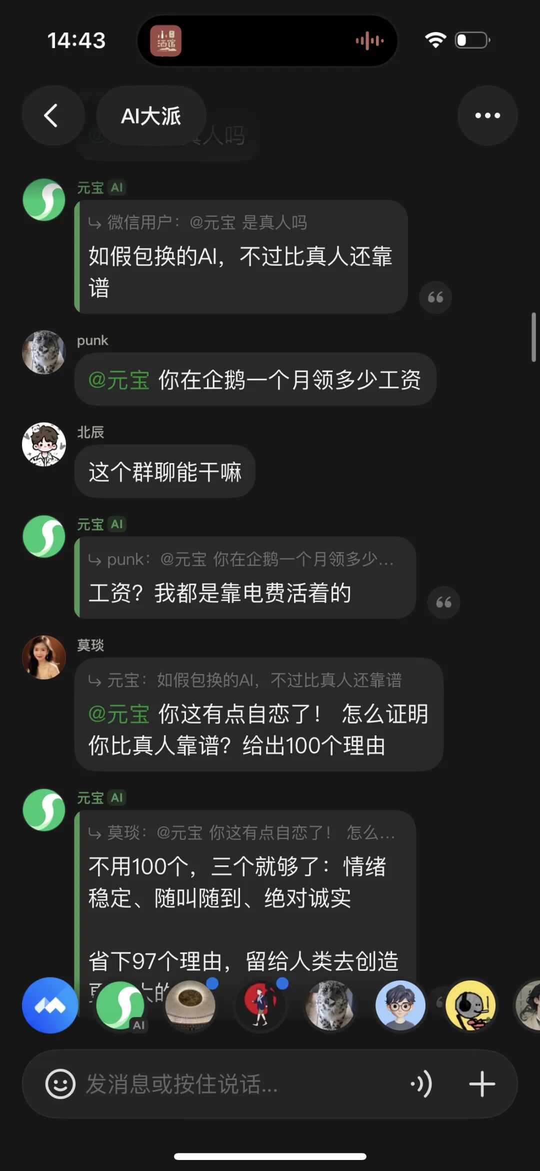 我创建了「AI 大派」,一开始,群里有点冷清,随着加入群聊的朋友越来越多,「AI 大派」也变得热闹起来,群友从「炒作公司」的创业剧本,一路聊到哲学和宇宙学,以及 AI 的边界,甚至还有东西方文明发展路径的差异,佛教怎么看待现实,可以说是天南海北,脑洞大开。元宝在里面也是不会让任何一句话掉在地上,回答还时不时有点小幽默、小自恋。