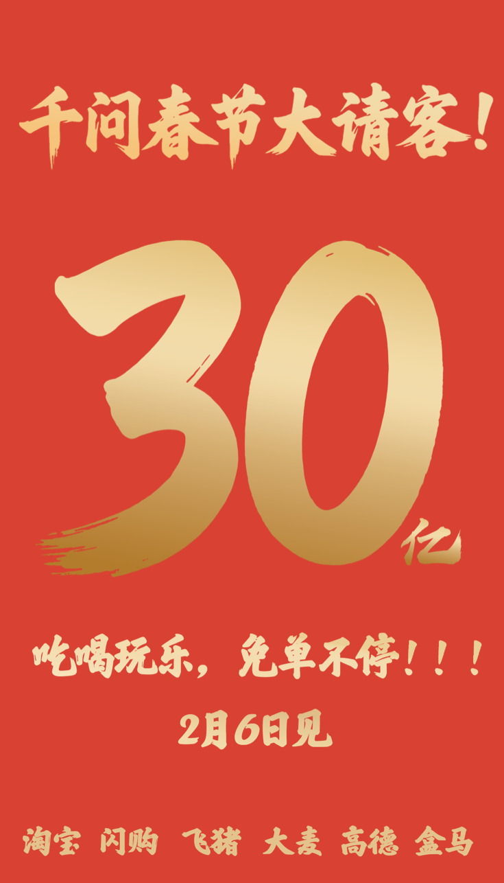 就在今天,千问 APP 官宣投入 30 亿启动“春节请客计划”,联手淘宝闪购、飞猪、大麦、盒马、天猫超市、支付宝等阿里生态业务,以免单形式请全国人民在春节期间吃喝玩乐。