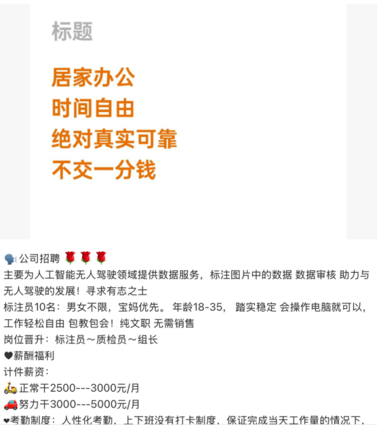 那时的招聘广告写得简单直白:“会用电脑即可”“在家可做”“日结工资”。门槛之低,几乎消除了所有技能壁垒:不需要学历证明,不考察专业背景,只要能分清红绿灯、听清普通话、点准鼠标,就能上岗。