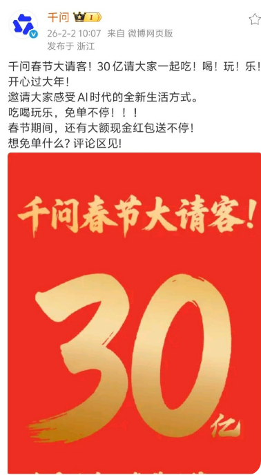春节临近,AI 大战正在持续升温。腾讯、百度、字节跳动等启动了春节红包计划,阿里千问自然也不会错过这场大战,宣布 30 亿元的“春节请客计划”,随后,近年来相对低调的马云也高调现身阿里千问办公楼,并对外宣布淘宝闪购、飞猪、大麦、盒马、天猫超市、支付宝等阿里生态业务将加入千问请客计划。