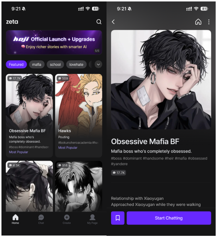 乍一看,Zeta 的功能设计和 Character.ai 这类产品没太大差别,主页推荐各种类型的 UGC AI 角色(黑手党、校园、爱恨交织等),点击即可互动。但真正的差异藏在交互体验里,与其说是和 AI 聊天 , 其实更像是在共创一本 AI 小说。