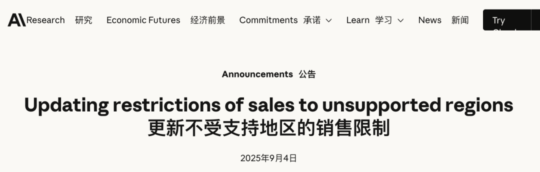 Anthropic 及其 CEO Dario Amodei 曾多次表态支持美国的出口管制政策。2025 年 9 月,Claude 曾特别更新其销售地区限制,专门指出将不向位于“对手国家”中国,或是中资持股超 50% 的海外子公司提供 Claude 商业访问渠道,随后还禁用了大批中国用户对 Claude Code 等工具的访问权限。